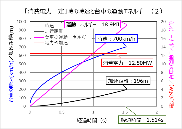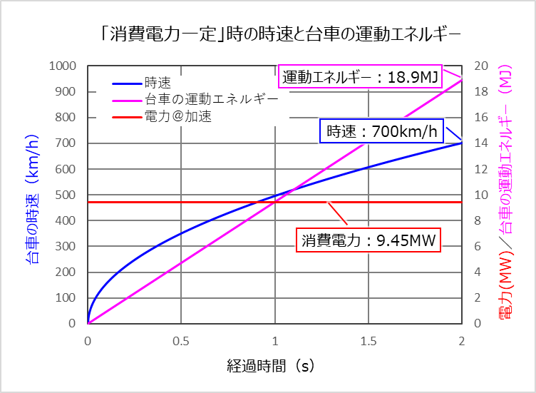 上のグラフから分かるように、一定の電力で1000kgの台車を2秒間で700km/hまで加速しようとすると、電力は9.45MW(効率は100%と仮定)になります。