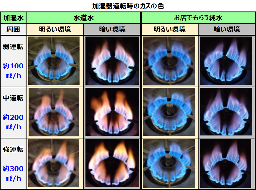 次に、「水道水」と「純水」で加湿したときの炎の色を表に貼り付けました。