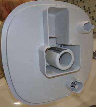 下の二つの画像は、加湿器にひと月くらい「純水」+「ヨードのミストで空気きれい」を入れて使った後のミスト発生部と、その上の部分の画像です。