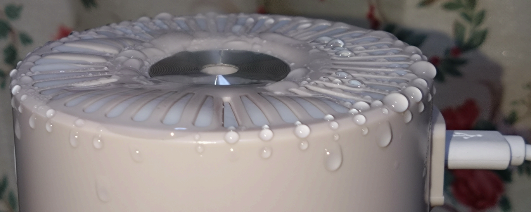 下の画像は、微細な穴が空いた圧電素子を使うタイプの加湿器ですが、調子に乗ってこの加湿器にも「ヨードのミストで空気きれい」入りの「純水」を入れて使い始めたところ、数日後にミストが周辺に付き始めて変だなと思っていました。
