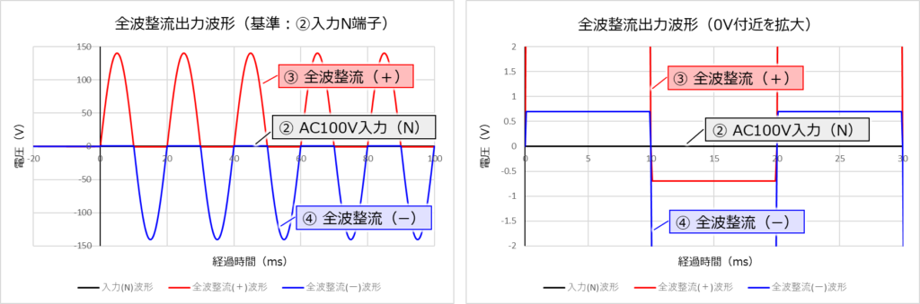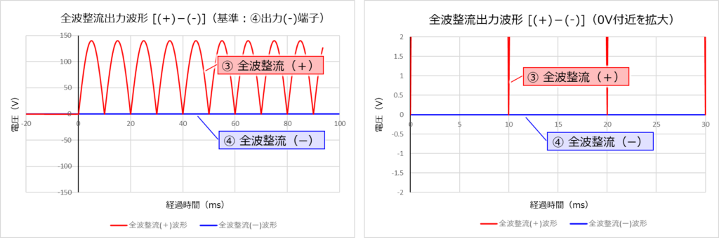 上の二つの波形では、「③ 全波整流(+)」と「④ 全波整流(ー)」の電位差を見ると同じですが、見た目は異なります。