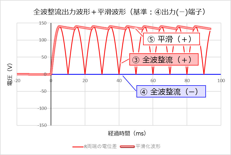 今回の「平滑波形」は、「④ 全波整流(ー)」を基準にして描きましたが、もちろん「② AC100V入力(N)」基準でも描けます。