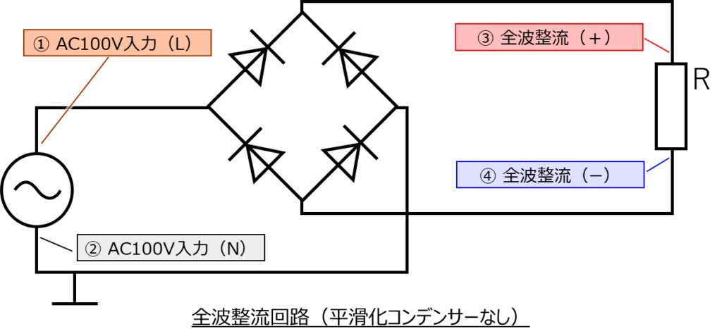 まず、「コンデンサー」がない場合の全波整流回路を下に示します。