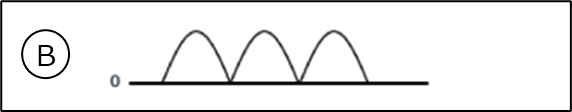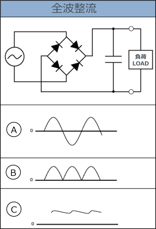 Ⓑ「コンデンサー」がない場合の「ダイオードブリッジ」の出力波形で、これが全波整流波形です。
