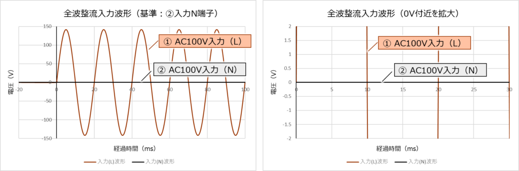 中央に引いた横軸の0V上には、黒い線で「② AC100V入力(N)」が描かれています。